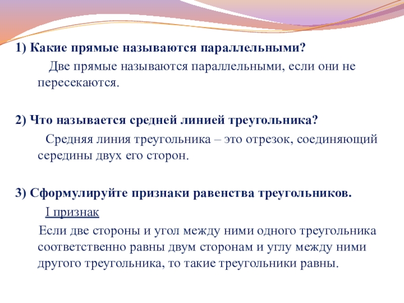 1) Какие прямые называются параллельными? Две прямые называются параллельными, если они не пересекаются.2) Что называется средней линией треугольника? Средняя линия треугольника – это отрезок, соединяющий середины двух его