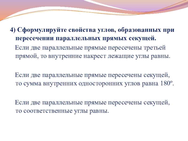 4) Сформулируйте свойства углов, образованных при пересечении параллельных прямых секущей.  Если две параллельные прямые пересечены третьей