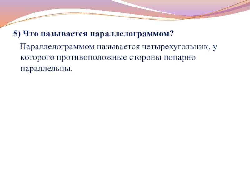 5) Что называется параллелограммом?  Параллелограммом называется четырехугольник, у которого противоположные стороны попарно параллельны.