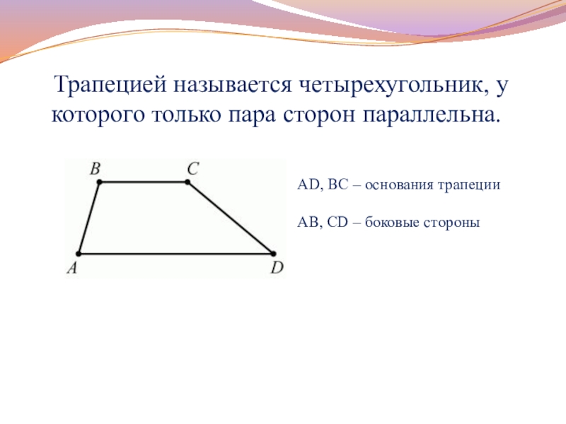 Слайд 6 Трапецией называется четырехугольник, у которого только пара сторон параллельна.