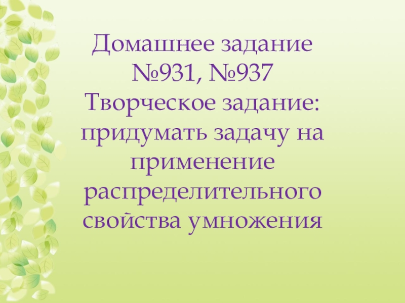 Слайд 17Домашнее задание №931, №937 Творческое задание: придумать задачу на применение распределительного свойства умножения