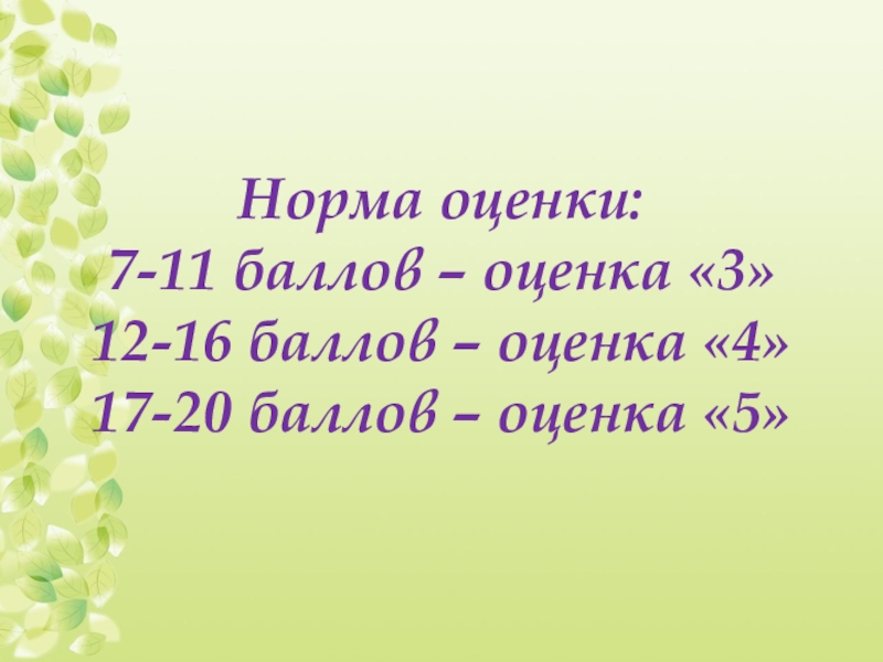 Норма оценки:  7-11 баллов – оценка «3» 12-16 баллов – оценка «4» 17-20 баллов – оценка