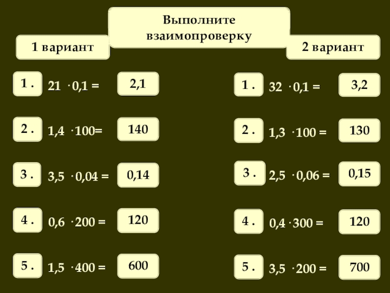 Математический диктант1 вариант2 вариантВыполните взаимопроверку2,11400,141206003,21301207000,15