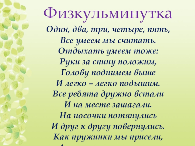 ФизкульминуткаОдин, два, три, четыре, пять,Все умеем мы считать.Отдыхать умеем тоже:Руки за спину положим,Голову поднимем вышеИ легко –