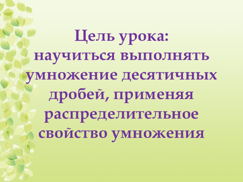 Слайд 8Цель урока: научиться выполнять умножение десятичных дробей, применяя распределительное свойство умножения