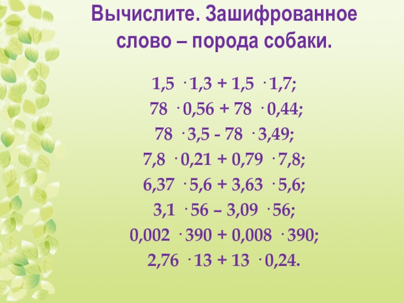 Вычислите. Зашифрованное слово – порода собаки.  1,5 · 1,3 + 1,5 · 1,7; 78 · 0,56
