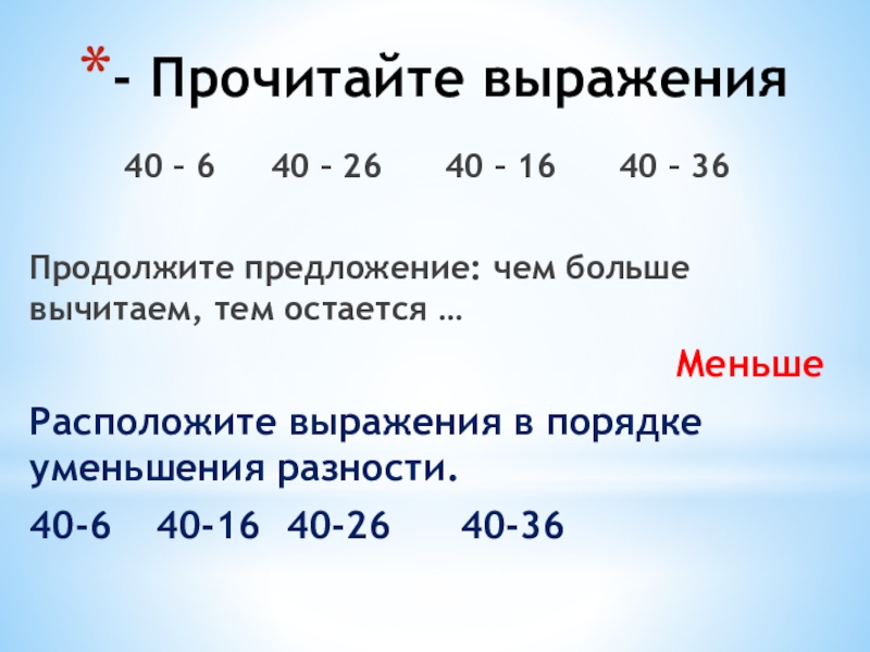 - Прочитайте выражения 40 – 6 	 40 – 26 	 40 – 16 	 40 –
