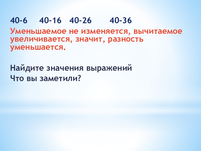 40-6		40-16	40-26		40-36Уменьшаемое не изменяется, вычитаемое увеличивается, значит, разность уменьшается.Найдите значения выраженийЧто вы заметили?
