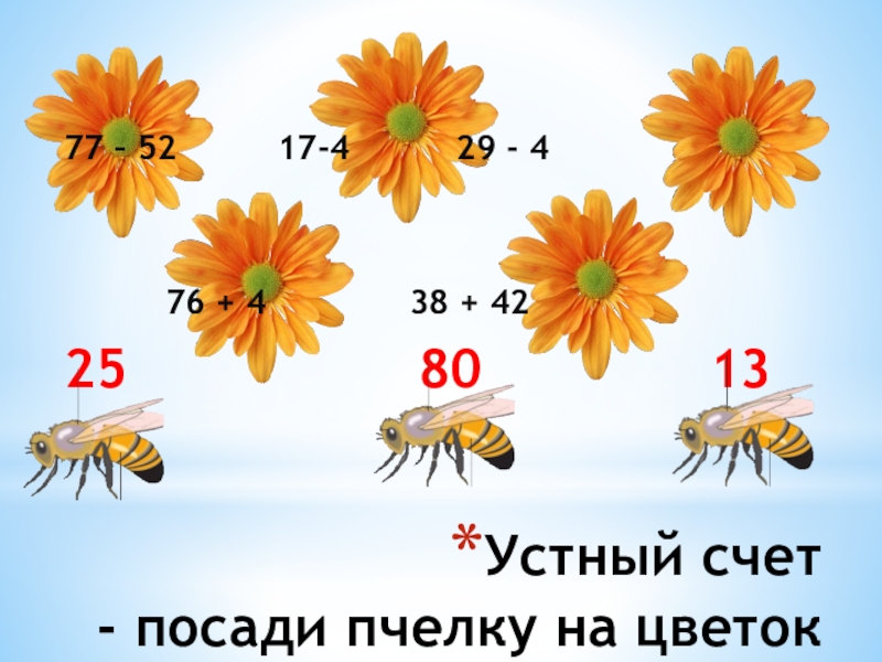 Устный счет - посади пчелку на цветок 77 – 52 17-4 29 - 4 76 + 4 38 + 4225 80
