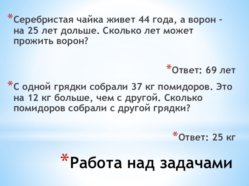 Работа над задачами Серебристая чайка живет 44 года, а ворон – на 25 лет дольше. Сколько лет