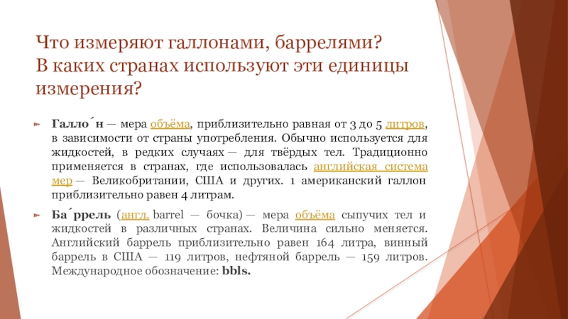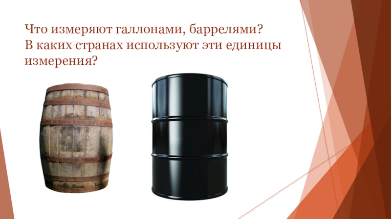 Слайд 5Что измеряют галлонами, баррелями? В каких странах используют эти единицы измерения?