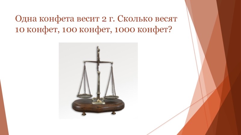 Слайд 8Одна конфета весит 2 г. Сколько весят 10 конфет, 100 конфет,