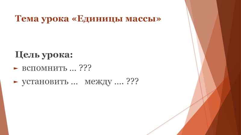 Тема урока «Единицы массы»Цель урока: вспомнить … ???установить …  между …. ???