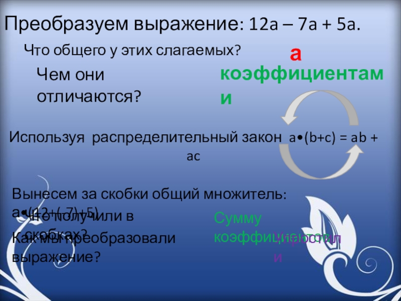 Вынесем за скобки общий множитель: а•(12+(-7)+5)