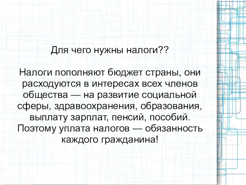 Для чего нужны налоги?? Налоги пополняют бюджет страны, они расходуются в интересах всех членов общества — на
