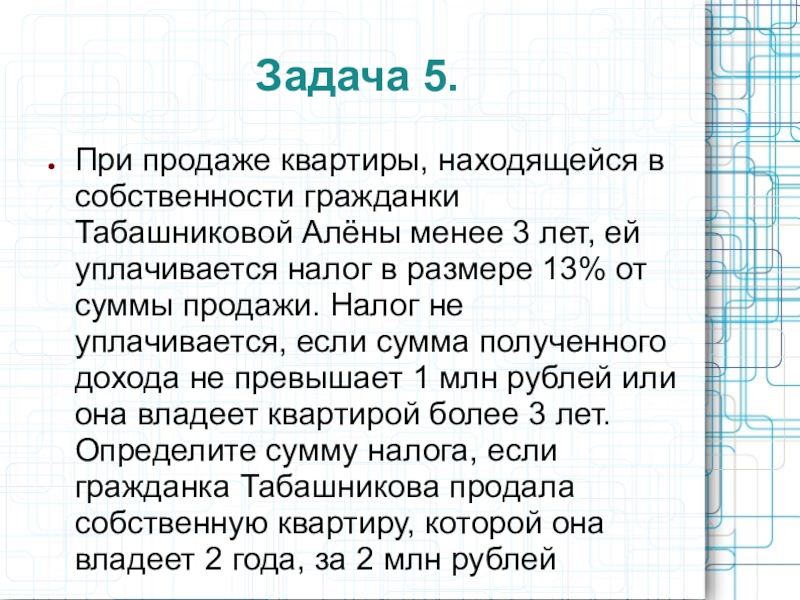 Задача 5.При продаже квартиры, находящейся в собственности гражданки Табашниковой Алёны менее 3 лет, ей уплачивается налог в