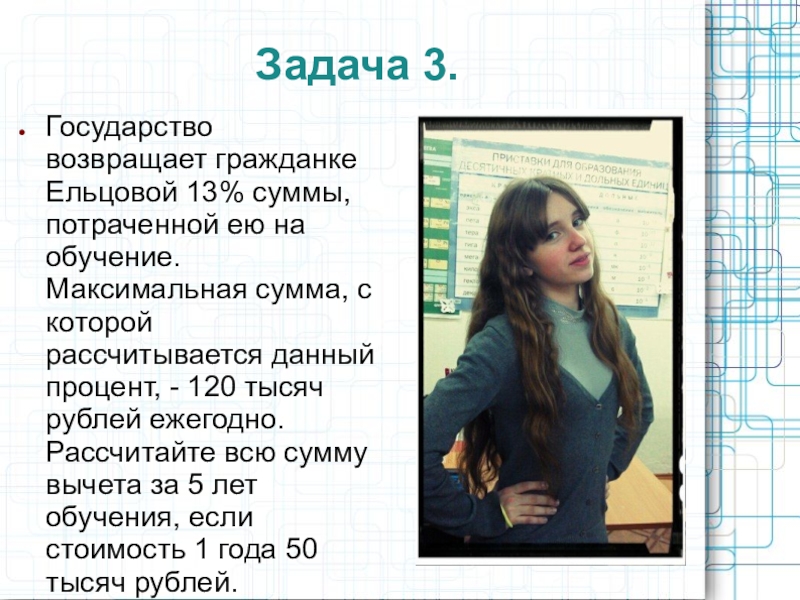 Задача 3.Государство возвращает гражданке Ельцовой 13% суммы, потраченной ею на обучение. Максимальная сумма, с которой рассчитывается данный