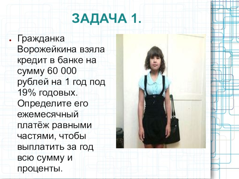 ЗАДАЧА 1.Гражданка Ворожейкина взяла кредит в банке на сумму 60 000 рублей на 1 год под 19%