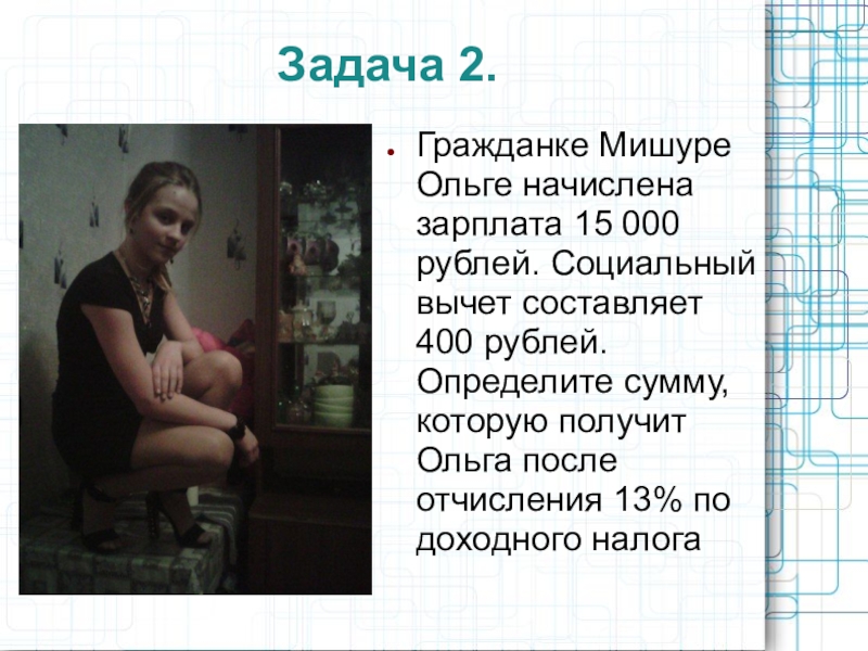 Задача 2.Гражданке Мишуре Ольге начислена зарплата 15 000 рублей. Социальный вычет составляет 400 рублей. Определите сумму, которую