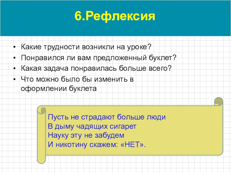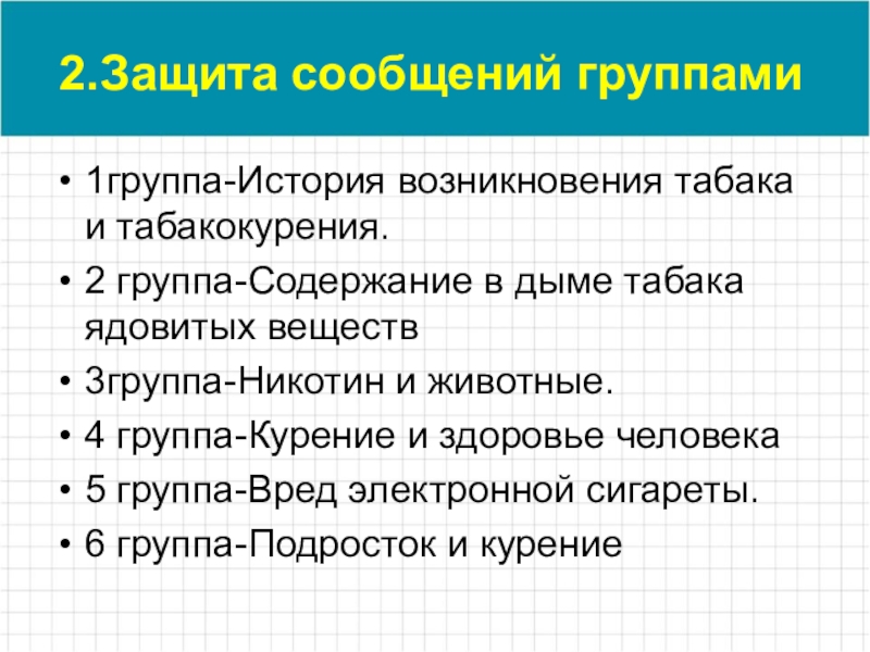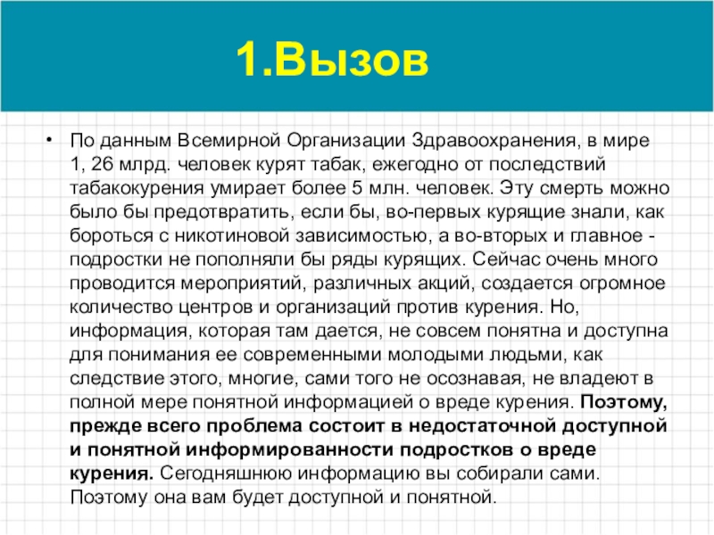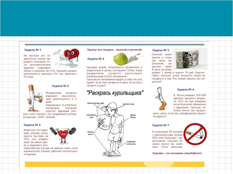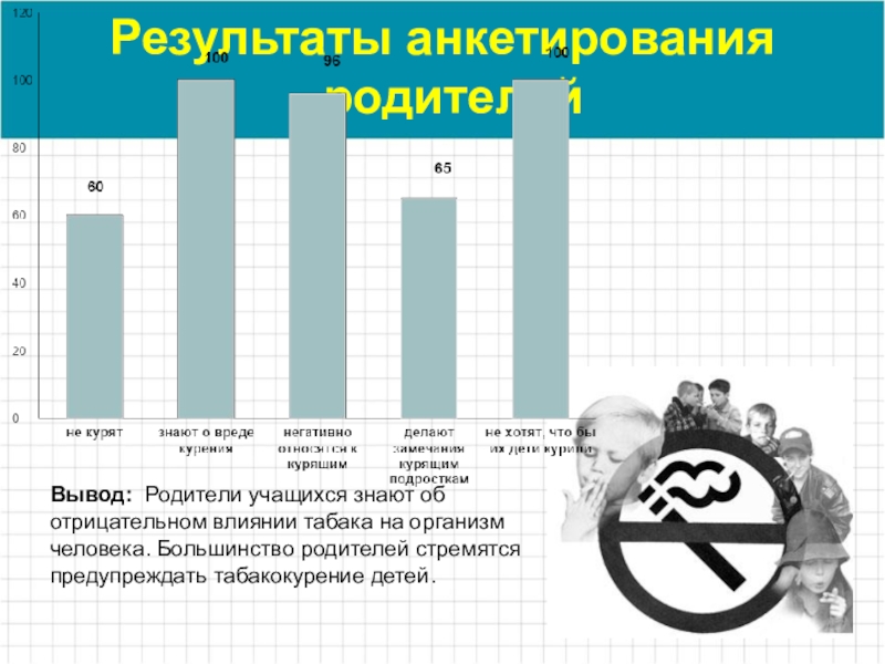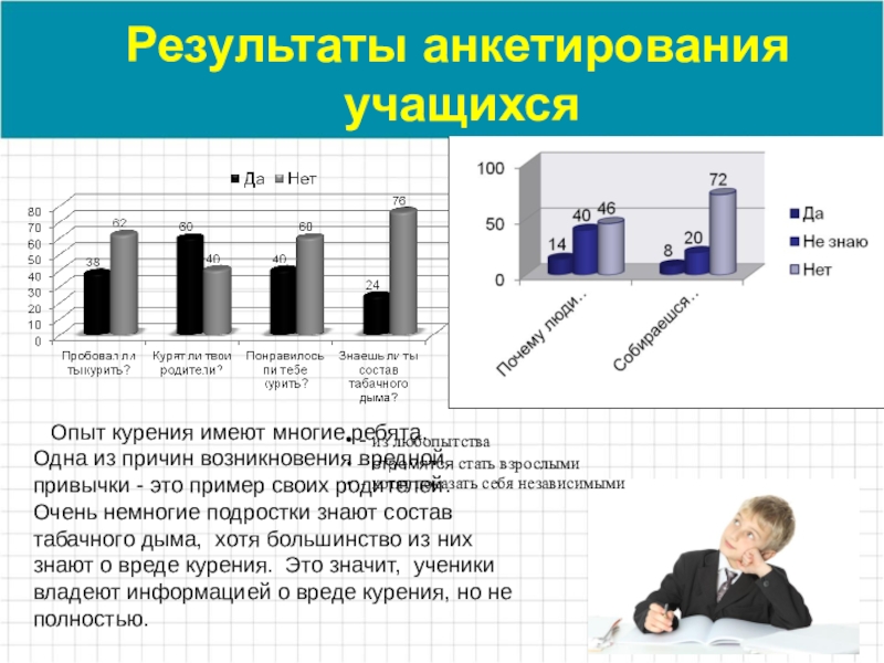 Одна из причин возникновения вредной привычки - это пример своих родителей. Очень немногие подростки знают состав табачного дыма, хотя большинство из них знают о вреде курения. Это значит, ученики владеют информацией о вреде курения, но не полностью.
