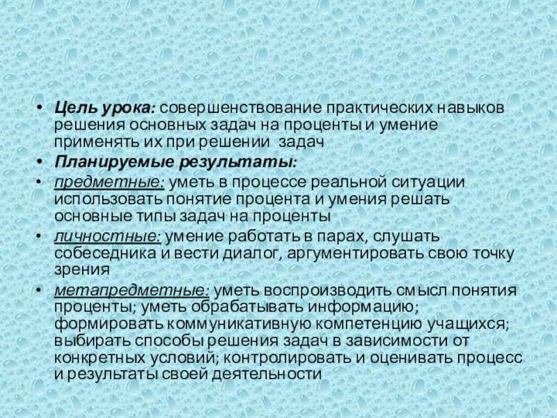 метапредметные: уметь воспроизводить смысл понятия проценты; уметь обрабатывать информацию; формировать коммуникативную компетенцию учащихся; выбирать способы решения задач в зависимости от конкретных условий; контролировать и оценивать процесс и результаты своей деятельности