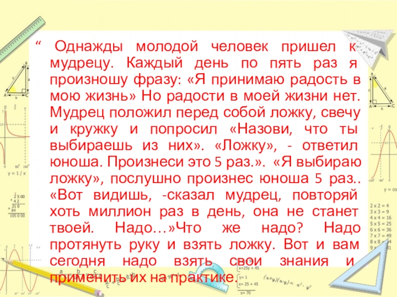 раз я произношу фразу: «Я принимаю радость в мою жизнь» Но радости в моей жизни нет. Мудрец положил перед собой ложку, свечу и кружку и попросил «Назови, что ты выбираешь из них». «Ложку», - ответил юноша. Произнеси это 5 раз.». «Я выбираю ложку», послушно произнес юноша 5 раз.. «Вот видишь, -сказал мудрец, повторяй хоть миллион раз в день, она не станет твоей. Надо…»Что же надо? Надо протянуть руку и взять ложку. Вот и вам сегодня надо взять свои знания и применить их на практике.