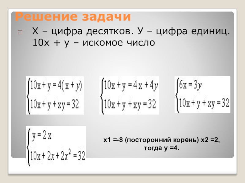 х1 =-8 (посторонний корень) х2 =2, тогда у =4.