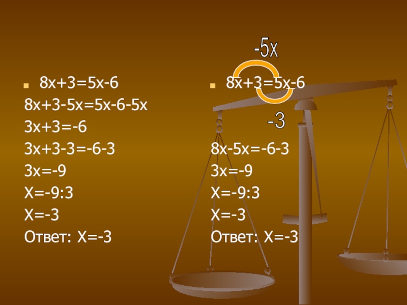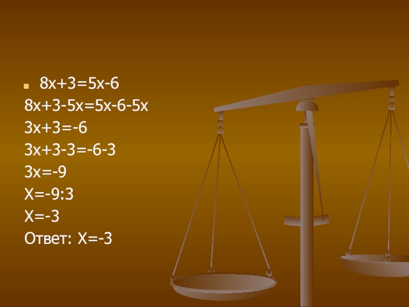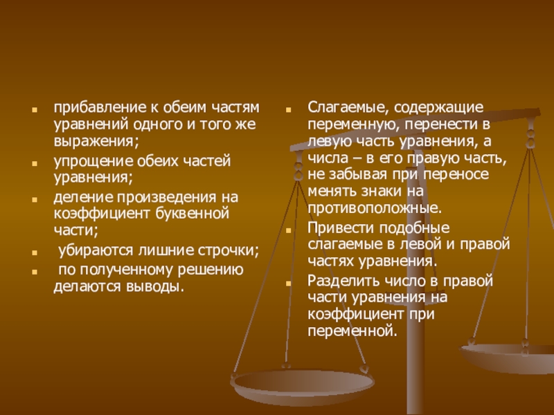 Слагаемые, содержащие переменную, перенести в левую часть уравнения, а числа – в его правую часть, не забывая при переносе менять знаки на противоположные.