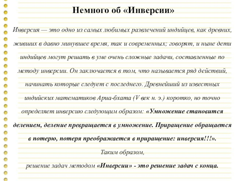 как древних, живших в давно минувшее время, так и современных; говорят, и ныне дети индийцев могут решать в уме очень сложные задачи, составленные по методу инверсии. Он заключается в том, что называется ряд действий, начинать которые следует с последнего. Древнейший из известных индийских математиков Ариа-бхата (V век н. э.) коротко, но точно определяет инверсию следующим образом: «Умножение становится делением, деление превращается в умножение. Приращение обращается в потерю, потеря преображается в приращение: инверсия!!!».