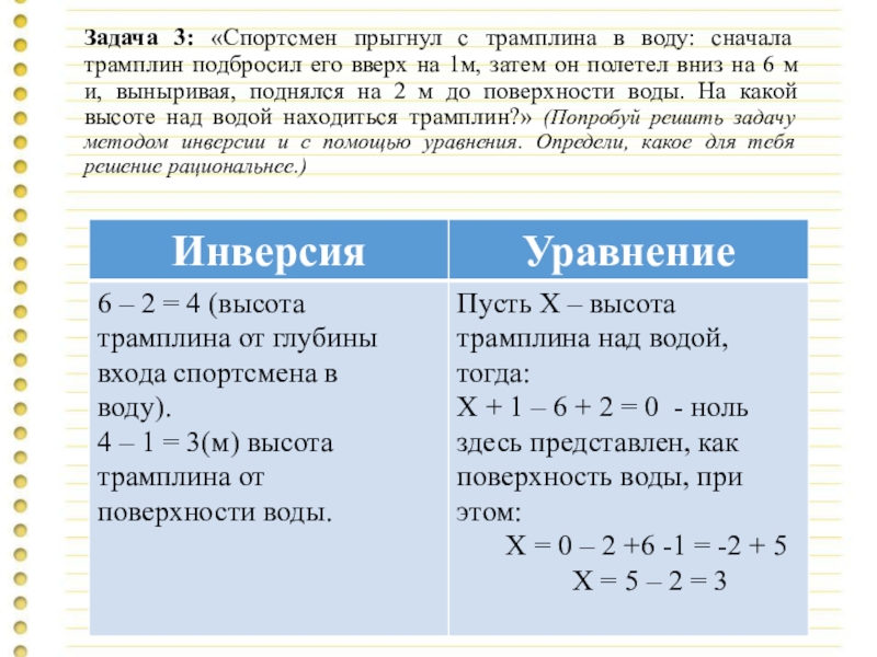 его вверх на 1м, затем он полетел вниз на 6 м и, выныривая, поднялся на 2 м до поверхности воды. На какой высоте над водой находиться трамплин?» (Попробуй решить задачу методом инверсии и с помощью уравнения. Определи, какое для тебя решение рациональнее.)
