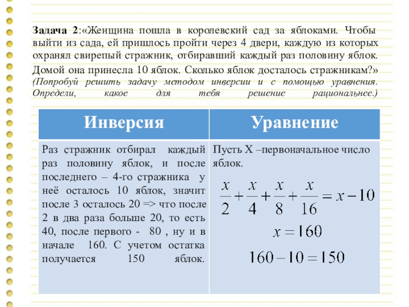 сада, ей пришлось пройти через 4 двери, каждую из которых охранял свирепый стражник, отбиравший каждый раз половину яблок. Домой она принесла 10 яблок. Сколько яблок досталось стражникам?» (Попробуй решить задачу методом инверсии и с помощью уравнения. Определи, какое для тебя решение рациональнее.)