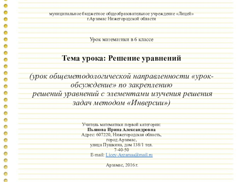 решений уравнений с элементами изучения решения задач методом «Инверсии»)