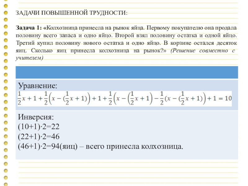 она продала половину всего запаса и одно яйцо. Второй взял половину остатка и одной яйцо. Третий купил половину нового остатка и одно яйцо. В корзине остался десяток яиц. Сколько яиц принесла колхозница на рынок?» (Решение совместно с учителем)
