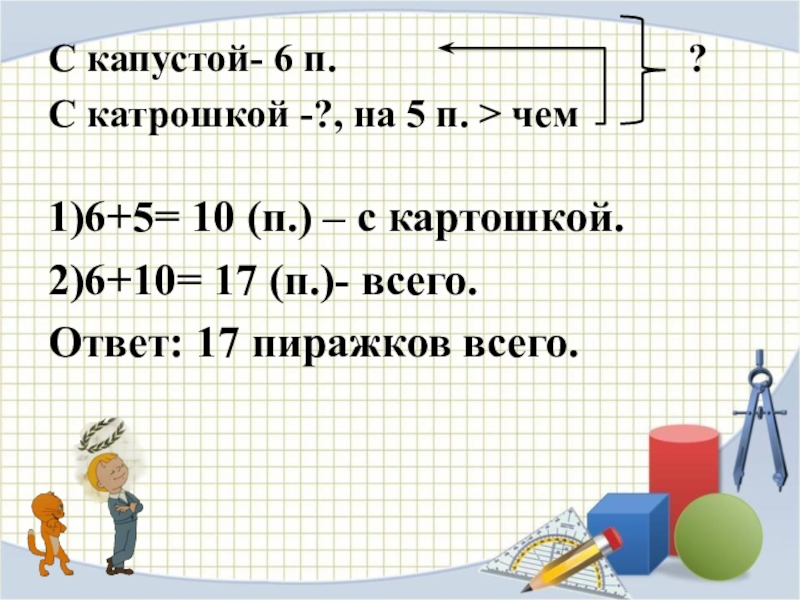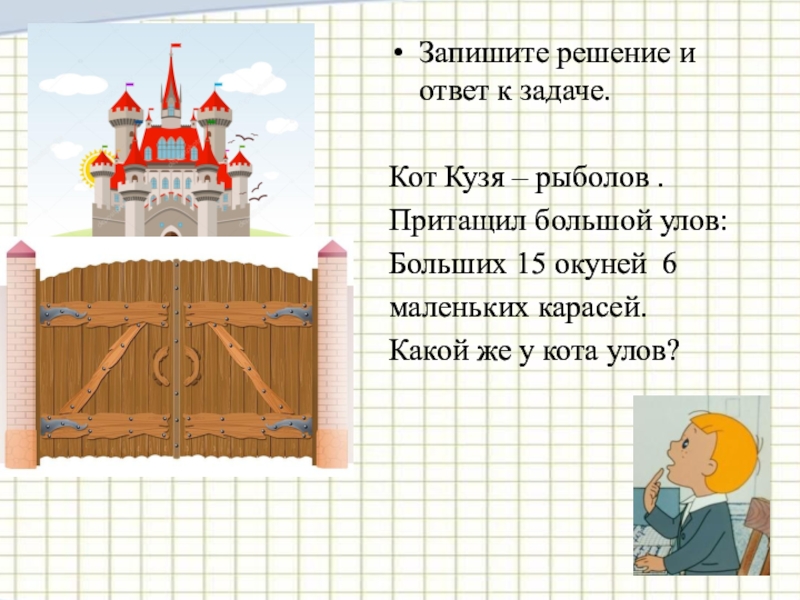 Запишите решение и ответ к задаче.Кот Кузя – рыболов .Притащил большой улов:Больших 15 окуней 6маленьких карасей.Какой же