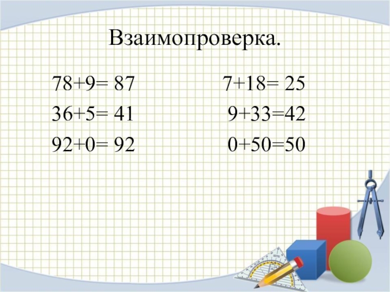 Взаимопроверка.78+9= 87        7+18= 2536+5= 41