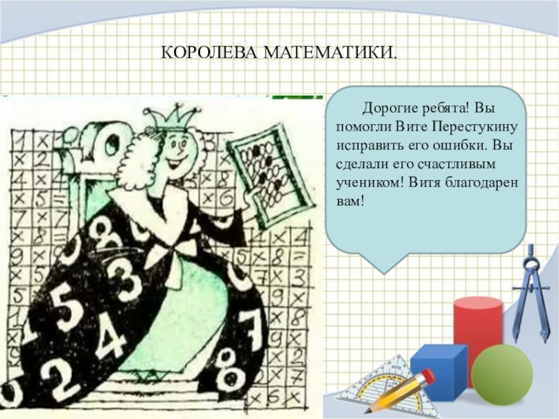КОРОЛЕВА МАТЕМАТИКИ.        Дорогие ребята! Вы помогли Вите Перестукину исправить его