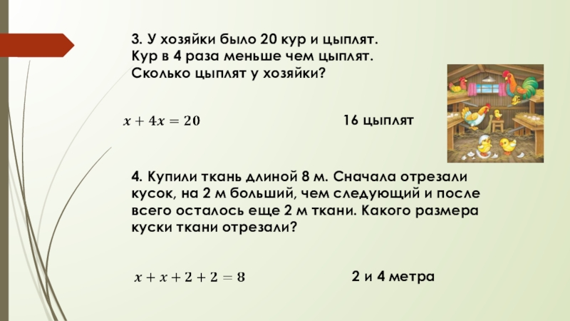 4. Купили ткань длиной 8 м. Сначала отрезали кусок, на 2 м больший, чем следующий и после всего осталось еще 2 м ткани. Какого размера куски ткани отрезали?