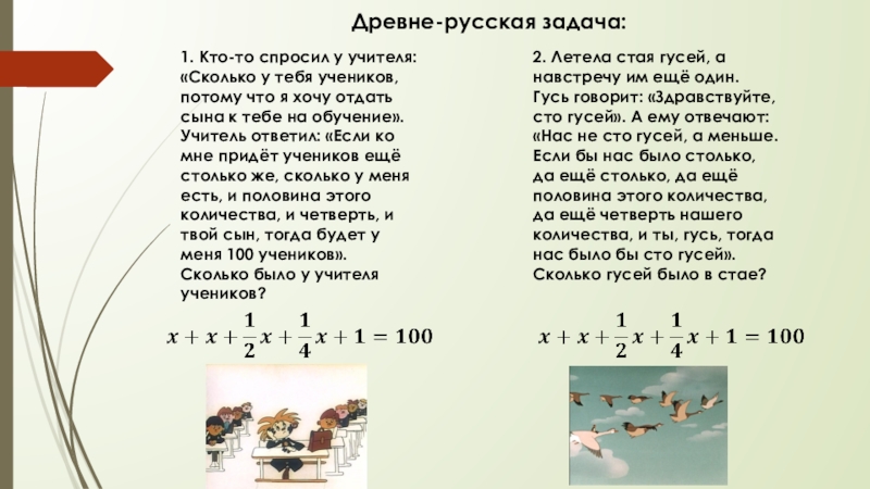 2. Летела стая гусей, а навстречу им ещё один. Гусь говорит: «Здравствуйте, сто гусей». А ему отвечают: «Нас не сто гусей, а меньше. Если бы нас было столько, да ещё столько, да ещё половина этого количества, да ещё четверть нашего количества, и ты, гусь, тогда нас было бы сто гусей». Сколько гусей было в стае?