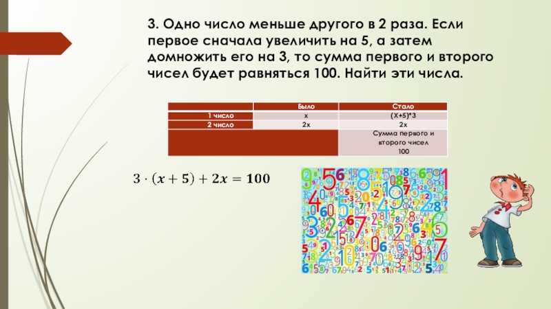 2. Одно число больше другого в 3 раза, а их разность равна 10. Что это за числа?