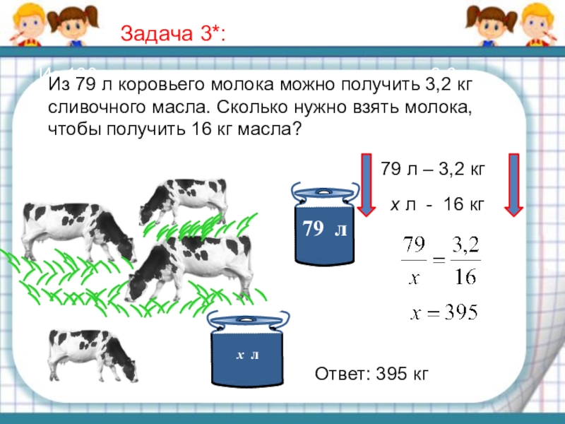 Из 79 л коровьего молока можно получить 3,2 кг сливочного масла. Сколько нужно взять молока, чтобы получить 16 кг масла?