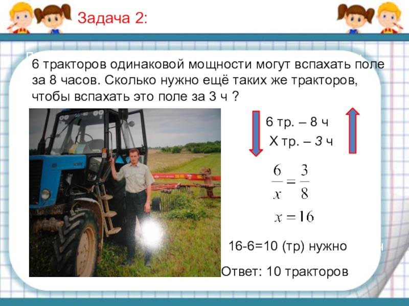 6 тракторов одинаковой мощности могут вспахать поле за 8 часов. Сколько нужно ещё таких же тракторов, чтобы вспахать это поле за 3 ч ?