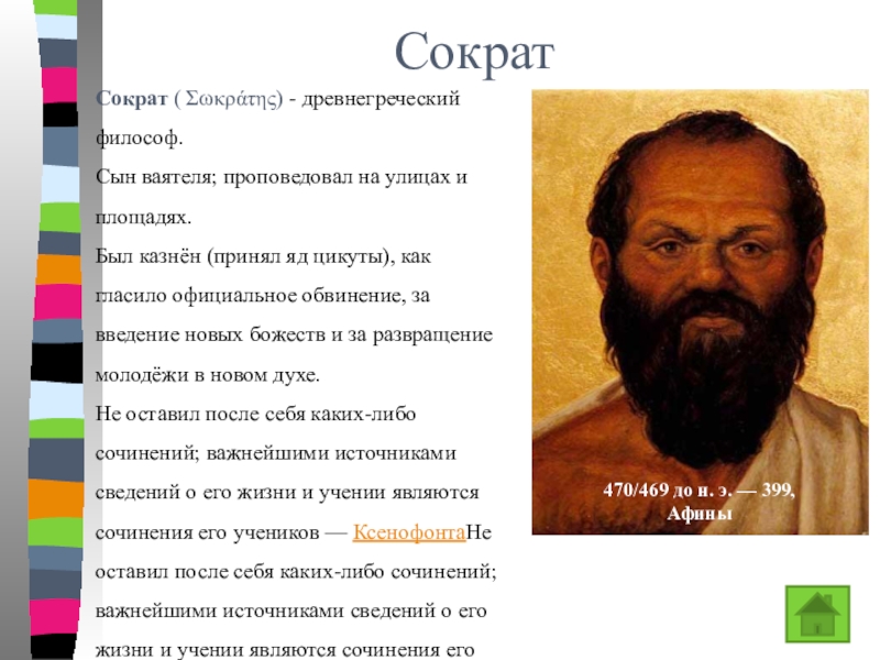 Не оставил после себя каких-либо сочинений; важнейшими источниками сведений о его жизни и учении являются сочинения его учеников — КсенофонтаНе оставил после себя каких-либо сочинений; важнейшими источниками сведений о его жизни и учении являются сочинения его учеников — Ксенофонта и Платона.