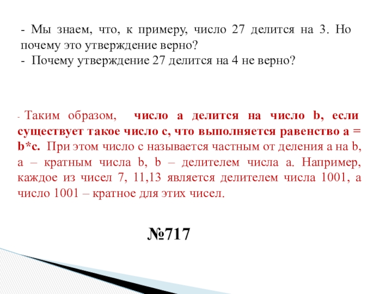 - Таким образом, число а делится на число b, если существует такое число с, что выполняется равенство а = b*c. При этом число с называется частным от деления а на b, а – кратным числа b, b – делителем числа а. Например, каждое из чисел 7, 11,13 является делителем числа 1001, а число 1001 – кратное для этих чисел.