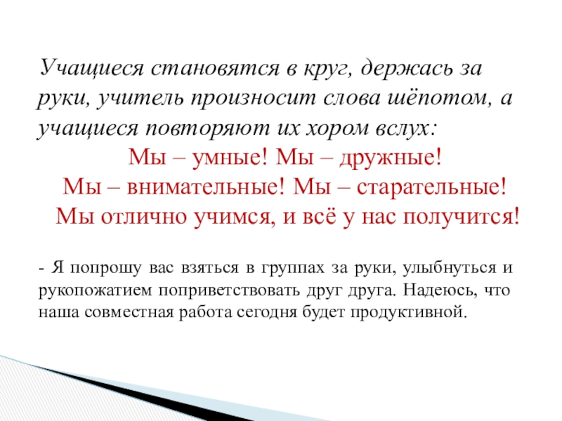 - Я попрошу вас взяться в группах за руки, улыбнуться и рукопожатием поприветствовать друг друга. Надеюсь, что наша совместная работа сегодня будет продуктивной.