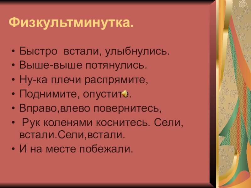 Физкультминутка.Быстро встали, улыбнулись.Выше-выше потянулись.Ну-ка плечи распрямите,Поднимите, опустите.Вправо,влево повернитесь, Рук коленями коснитесь. Сели,встали.Сели,встали.И на месте побежали.