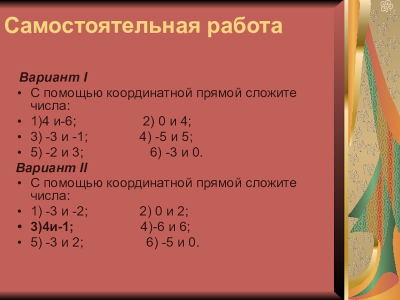 Самостоятельная работа Вариант IС помощью координатной прямой сложите числа:1)4 и-6;