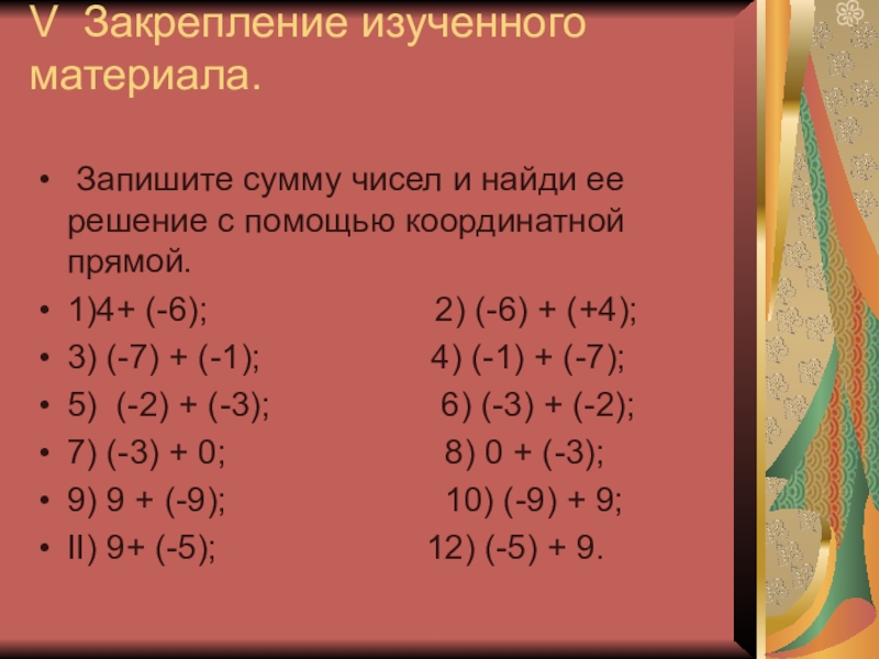 V Закрепление изученного материала.  Запишите сумму чисел и найди ее решение с помощью координатной прямой.1)4+ (-6);