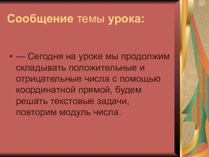 и отрицательные числа с помощью координатной прямой, будем решать текстовые задачи, повторим модуль числа.