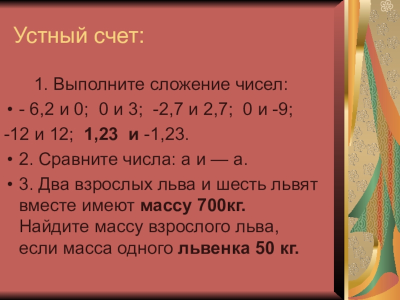 Устный счет: 1. Выполните сложение чисел:- 6,2 и 0; 0 и 3; -2,7 и 2,7; 0 и -9; -12 и 12; 1,23 и -1,23.2. Сравните числа: а и — а.3. Два взрослых льва и шесть львят