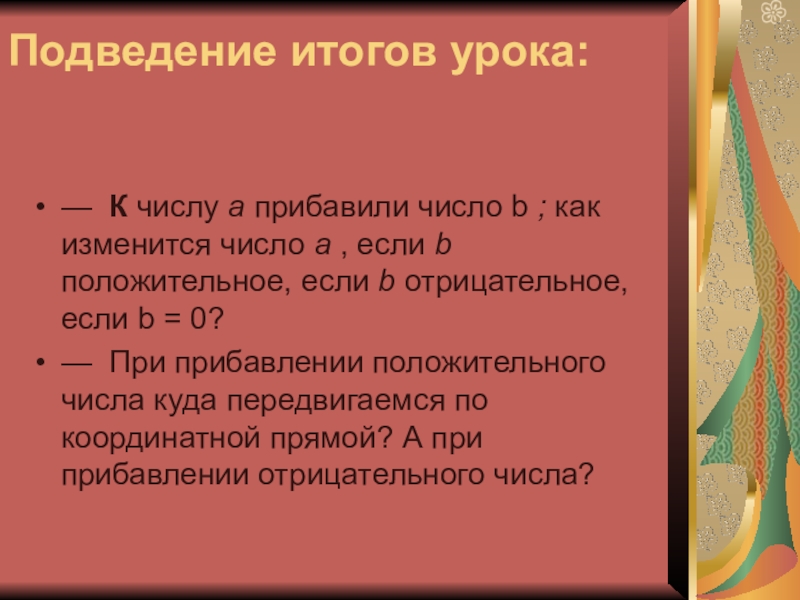 — При прибавлении положительного числа куда передвигаемся по координатной прямой? А при прибавлении отрицательного числа?
